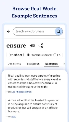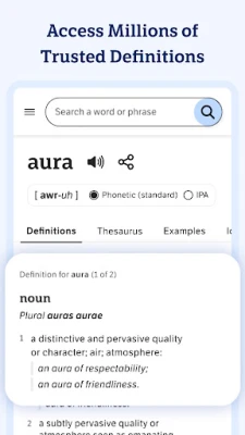 With more than 2 million trusted definitions and synonyms, this English dictionary and thesaurus app for Android is optimized for your mobile device. Improve your English vocabulary, whether you're just starting your learning journey or you're already a word wizard. Install the app for access to definitions and synonyms whenever and wherever you need them — no bulky books necessary. Flip to dark mode to give your eyes a break, or stick to the traditional set-up.