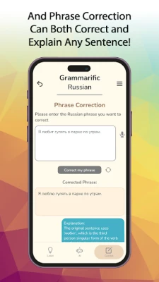 - Phrase Correction Analysis: Elevate your written Russian through our Phrase Correction tool, which provides detailed corrections with explanations to refine your grammar and usage.