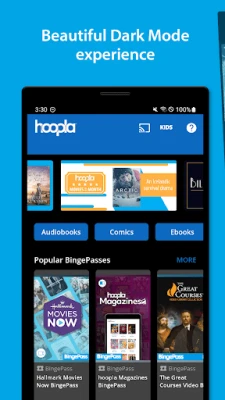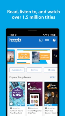 Discover limitless entertainment and knowledge with hoopla Digital. Access more than 1.5 million audiobooks, eBooks, comics and manga, music, movies, TV, and more with BingePass. Read, listen, and watch 24/7 without ads or late fees, free with your library card!