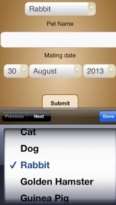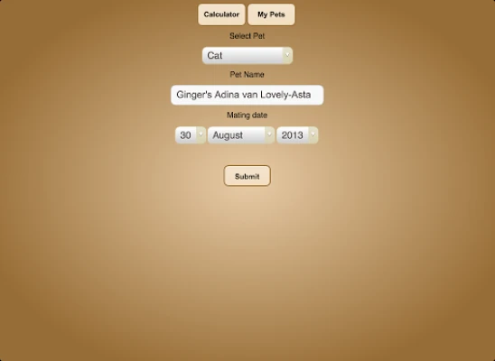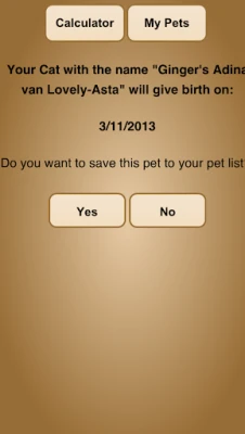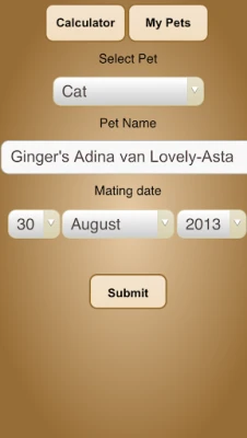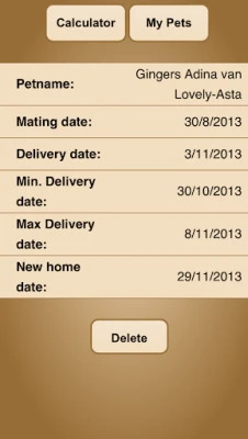 This app helps you calculate when your pet is going to deliver her youngs. You can input the mating date and the app calculates when your pet is due to deliver (within a timespan corresponding the animal kind). The app also calculates when the newly born pets can be placed in a new home.